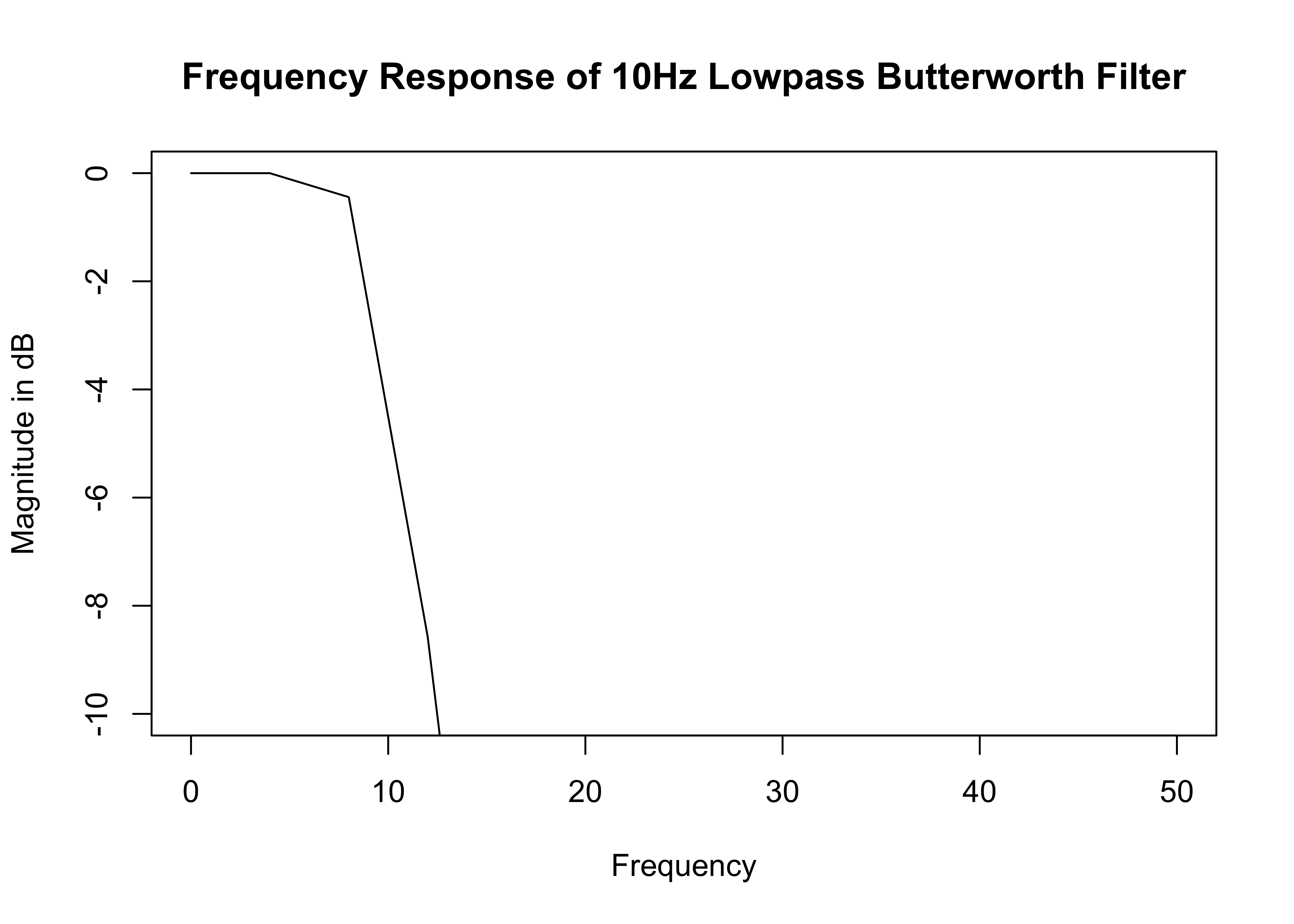 xlim = c(0, 50), main = "Frequency Response of 10Hz Lowpass Butterworth Filter", ylab = "Magnitude in dB", xlab = "Frequency"