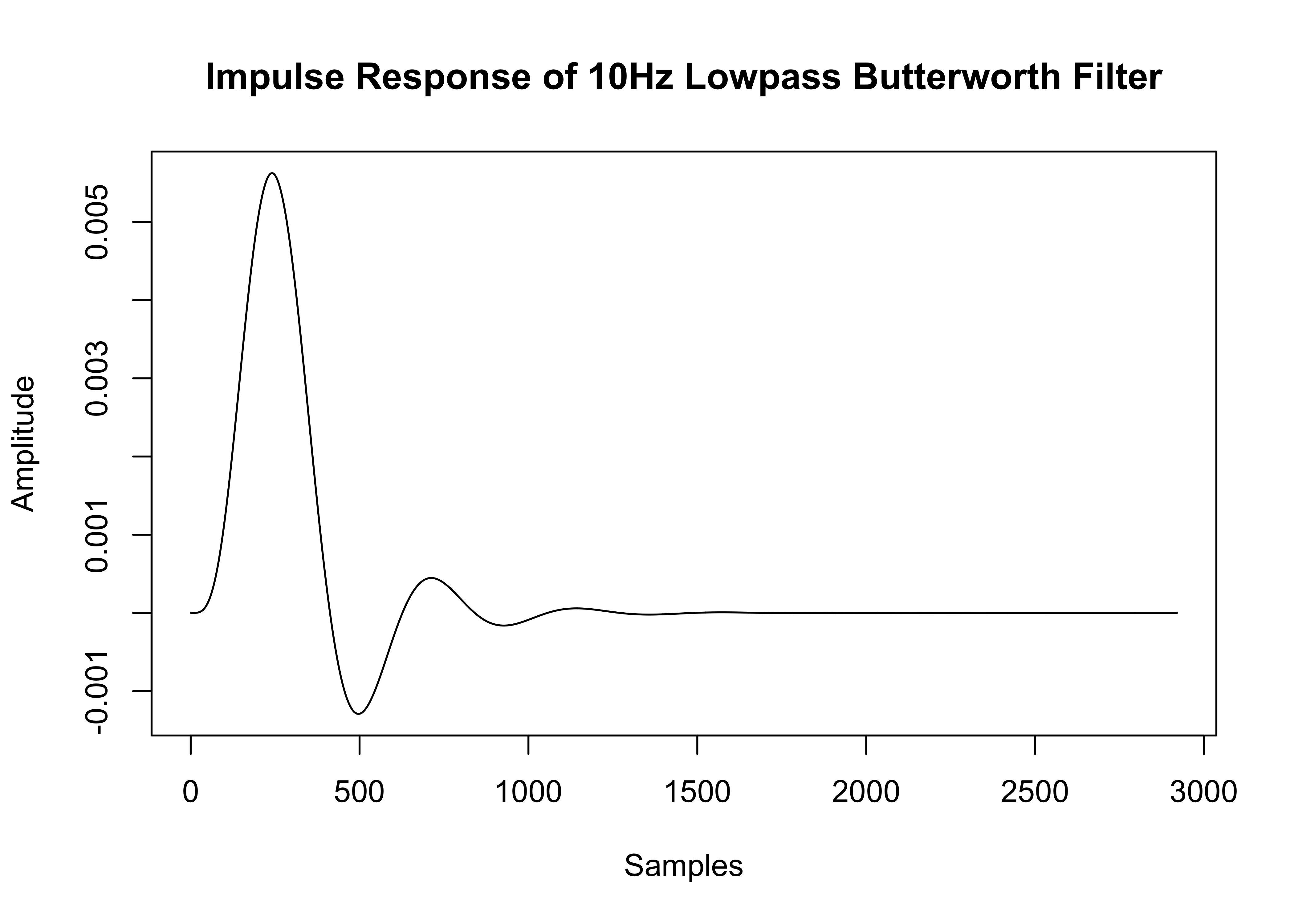 plot(btr$x, type = "l", main = "Impulse Response of 10Hz Lowpass Butterworth Filter", ylab = "Amplitude", xlab = "Samples")