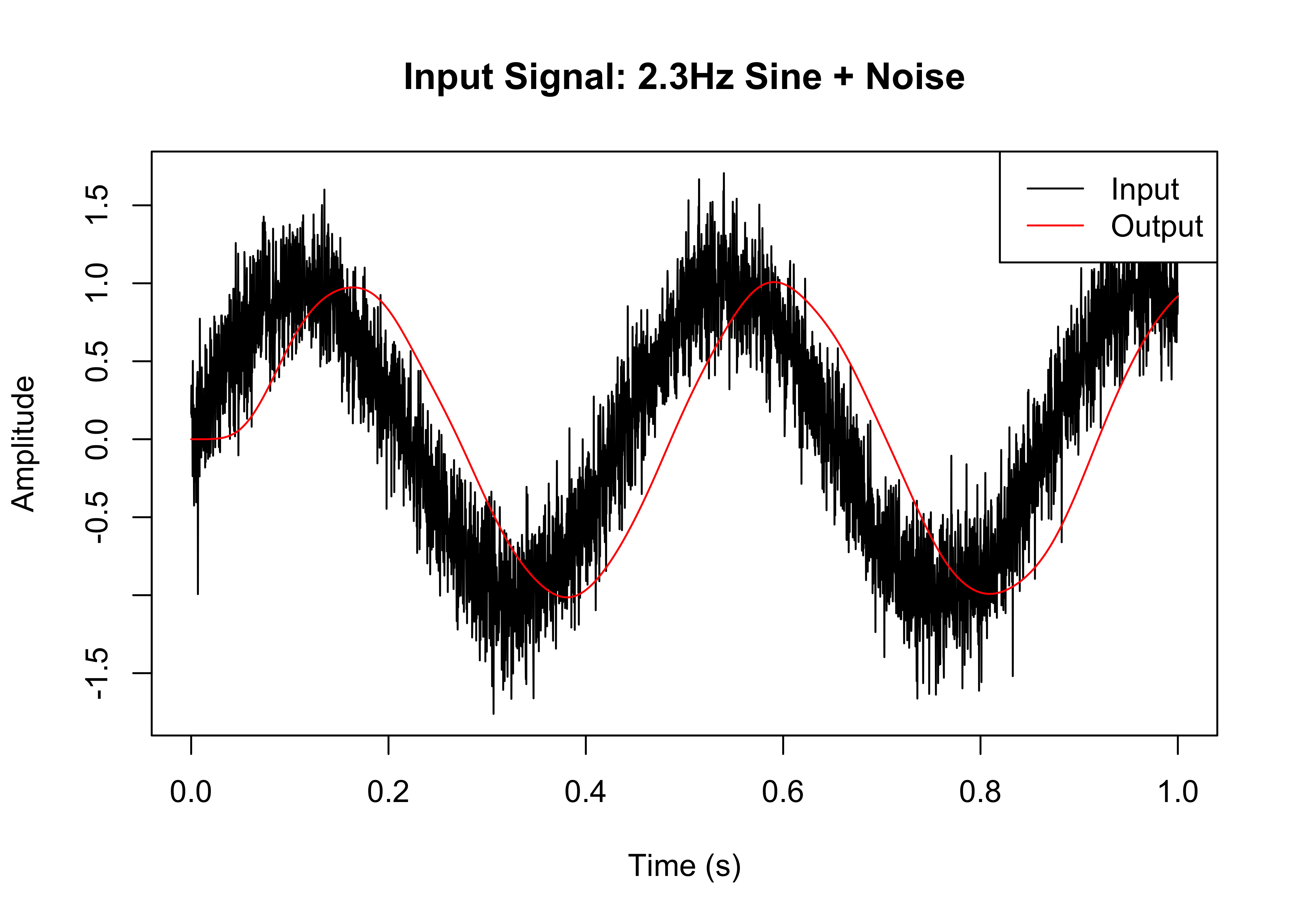 plot(t, x, type = "l", main = "Input Signal: 2.3Hz Sine + Noise", ylab = "Amplitude", xlab = "Time (s)")